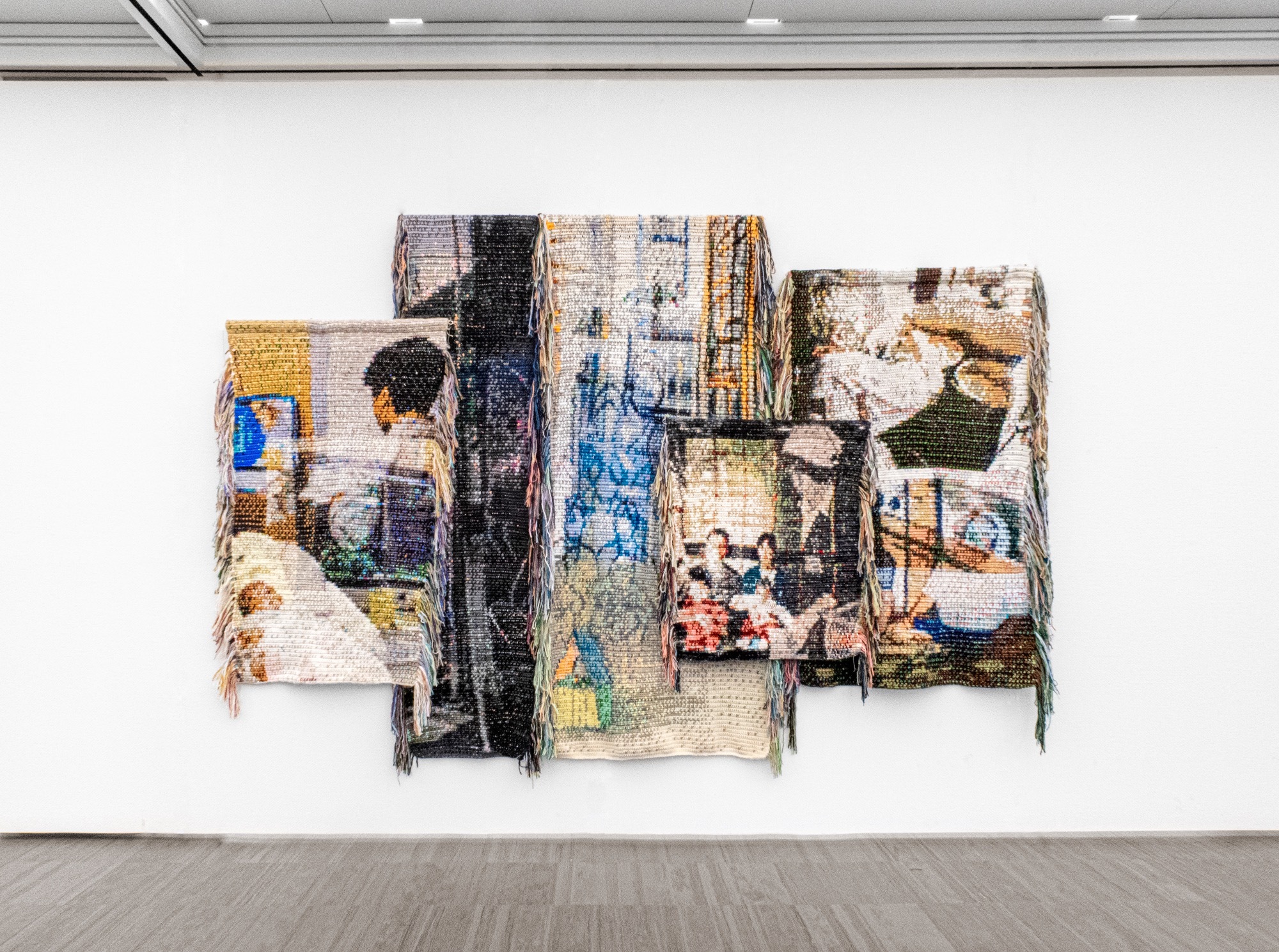 中央に配置した二点は、家の外観と、居間に夫・妻・子ども二人が並ぶ様子のスケッチを編んだものです。人物像は輪郭のみで描かれ、消えかけた像として表されています。この4人世帯は、税制や社会保障を考える際のモデルケースとして用いられる「標準家族」と呼ばれる単位です。日本では1960年代以降、この標準家族を基準として「家庭」が想定されてきました。しかし現在、この条件に当てはまる世帯は全体の数%に満たないと言われています。それでもなお、私たちが家庭を想像した時に無意識に思い浮かべる家族像として存在しているため、消えかけた形で作品の中心に配置しました。